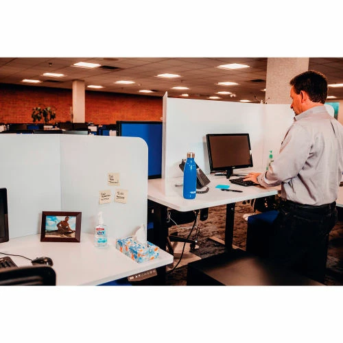 This economical desk shield can easily provide your office with some separation from coworkers. Made of corrugated plastic, these durable shields come 6 in a pack to allow you to quickly outfit a small office to begin the return to work. The back measures 46-1/2″ long with 23-1/2″ sides and a height of 23-1/2″ with an 8″ half-moon cutout for wires. These shields give employees space to work while providing proper social distancing. Comes with 6 shields per pack.