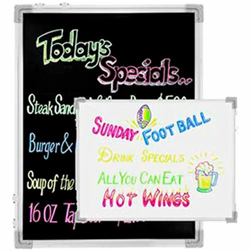 Reversible write-on boards 24″ x 36″. Double sided, one side white – one side black. Comes with 5 rain proof markers. Heavy duty construction provides durability. Pre-attached hooks for vertical or horizontal hanging. Durable 5/8″ aluminum frame is made of rust resistant grade 304 stainless steel. Hardware for indoor & outdoor use.