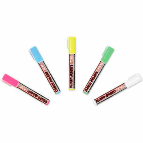 Rain proof markers come in five colors: blue, green, white, yellow and pink. They are smudge proof and rain proof. Easily wipes clean with a damp paper towel. For use with write on boards, glass or windows.