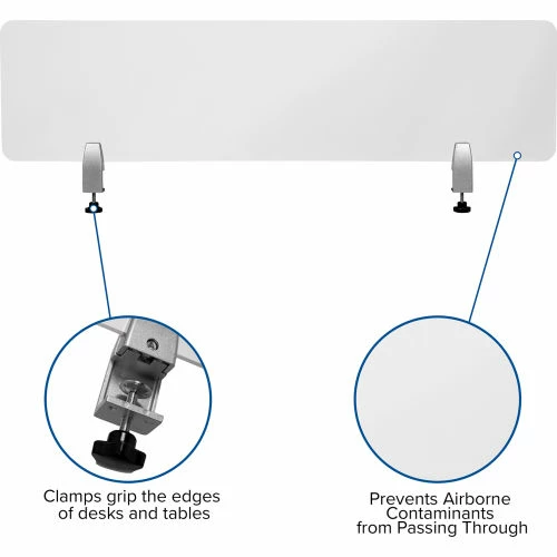Great for school and office desks, this cough guard will create ways for individuals to have meaningful face to face conversations while helping to mitigate the risks. Adjustable clamps can be easily loosened and remounted in a different location when different configurations are needed. For those in high demand environments in close proximity to others, this shield is a must have. This clear desk shield is transparent to allow first hand discussions essential for student achievement and may help lessen the emotional toll of social distancing. Enable staff and students alike to maintain personal interactions for a more enjoyable work and school day.